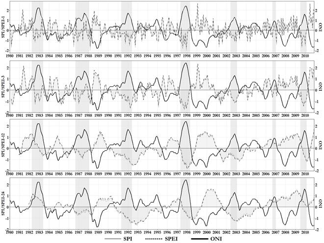 Figure 6: Monthly averaged series for the SPI and SPEI (in-situ) in the MCRB corresponding to the scales of 1, 3, 12, and 24 months and the ONI