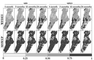 Thus, the analysis confirms that the reanalysis WFDEI and MSWEP adequately identify the drought events in the MCRB. For the meteorological drought indicators, the performance of the products improves as the time scale of analysis increases, with an optimum close to the 12 months-scale of accumulation. In addition, the MSWEP can predict correctly temporal and spatial trends of droughts in the MCRB, with consistently better correlations and minor mean errors than the WFDEI product. Similarly, for hydrological droughts, Fig. 12 depicts a better performance for the MSWEP, with mean values of the Spearman correlation (ρ) around 0.82, a bias below 40% in contrast with the 0.67 and 45% values of the WFDEI.