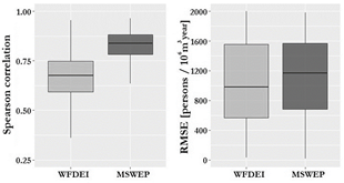 Although both reanalysis datasets have errors with respect to the in-situ indicators, Figs. 10 and 11 show that the RMSE of the MSWEP (mean 0.61) is much lower than that of the WFDEI (mean 0.83). Moreover, the SPEI differences are slightly larger than the SPI ones, regardless of the reanalysis dataset used. This may be due to the choice of the equations for potential and actual evapotranspiration, and the regional scale of the analysis. Thus, it is recommended to perform further analyses for hydrological droughts with more equations for evapotranspiration and with other indices based on runoff and streamflow.