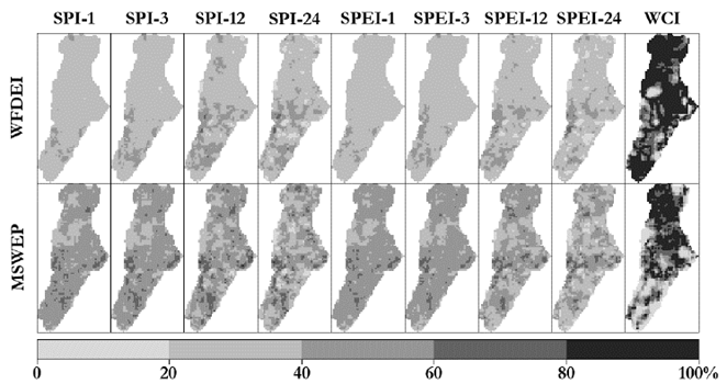 Regardless of the reanalysis dataset considered, the large differences identified in the WCI calculations are not equally found in the meteorological drought indicators. This is due to the order of magnitude of the WCI, since it is not standardized, and it magnifies the differences where the largest population is concentrated.