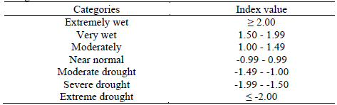 The SPI results are classified using a qualitative scale in which positive and negative values correspond to wet and dry events, respectively. A drought event is identified when the SPI value is equal to or less than -1.0 [25].