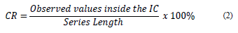 At last, we evaluated the CI through the containing ratio (CR) indicator [31], which is a ratio expressed as a percentage, between the number of observed values within the limits of the 90% IC and the total length of the observed variable, as shown in eq. (2).