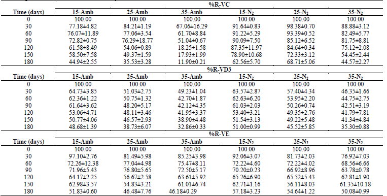 Table 1: Retention percentages of vitamins (%R-V) in CP+FAC packaged with atmospheric air and with N2 during storage at three temperatures (15, 25, 35 °C) and during 0, 30, 60, 90, 120, 150, and 180 days.