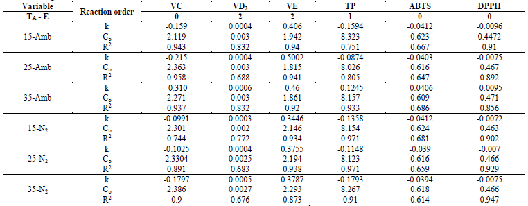 Degradation kinetic parameters in vitamins and antioxidants in coconut powder fortified with functionally active compounds (CP+FAC) during storage represents a valuable tool to predict the product’s shelf life. The aim of this research was to evaluate the degradation kinetics during storage of vitamins (C, D3, and E), total phenols, and properties associated to antioxidant activity. Vitamins were quantified via high-resolution liquid chromatography and the antioxidant activity through DPPH and ABTS free radical scavenging activity. An experimental design was used with two-factor factorial design: 1) storage time (tS) and 2) treatment: temperature (TA) - type of packaging (N2 and atmospheric air), where the dependent variables were adjusted to zero-, first-, and second-order kinetic models. In general, losses of FAC were significant with respect to the factors evaluated and their interactions, with minor changes at lower TA and packaged with N2, indicating that the degradation kinetics of the FAC is slower under these storage conditions. Increased storage temperature reduced FAC stability, where the Arrhenius equation was able to quantify the effect of temperature of the rate of deterioration reactions of the FAC.
