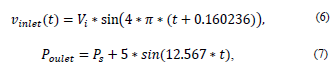 For the input speed and the output pressure, a pulsatile flow was considered, which was programmed in two functions (UDF) [22] as follows: