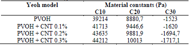 Table 2: Material constants of PVOH without reinforcement and PVOH reinforced with CNT for the Yeoh hyperelastic model.