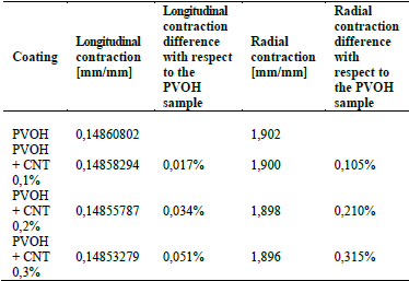 Table 4 shows the results of longitudinal and radial contraction and the percentage difference that exists between the PVOH coating with and without CNT.