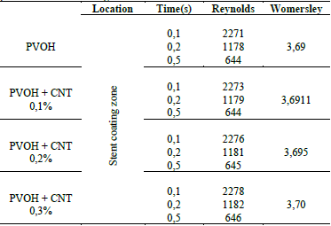 Table 5: Reynolds number values and Womersley number for each instant time of the pulse in the zone-coating and zone-downstream.