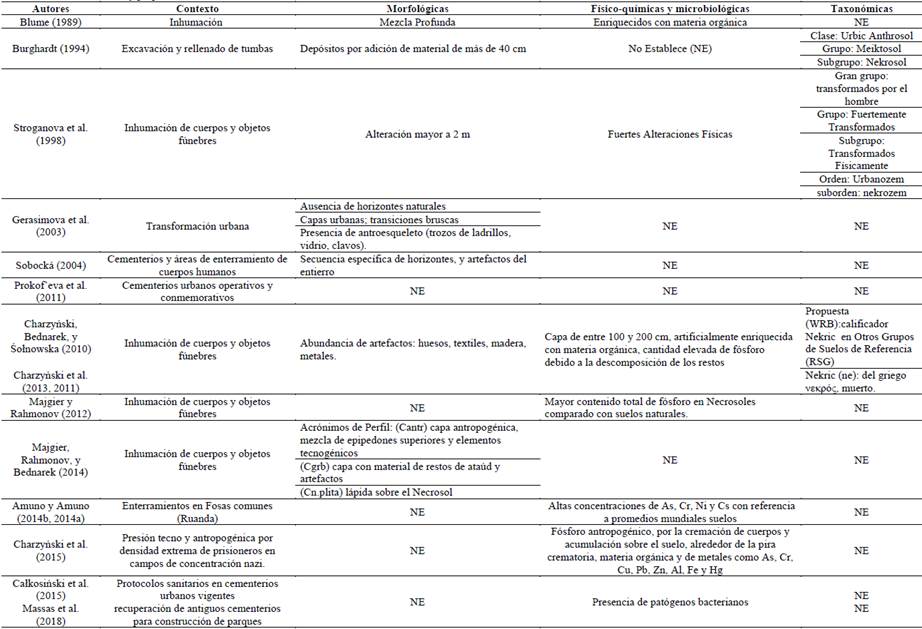 El estudio de la literatura científica producida respecto a la conceptualización de los suelos de cementerio llamados Necrosoles, se encontró que en este campo hay diversos enfoques que los estudian desde las ciencias básicas para la pedología, así como aproximaciones interdisciplinarias que integran conocimientos en geo-arqueología y el campo forense y de la interpretación de los impactos ambientales que generan las necrópolis.