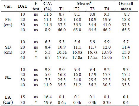 Table 2: Summary of F test and mean plant height (PH), stem diameter (SD), number of leaves (NL) and leaf area (LA) of ornamental sunflower cv. Anão de Jardim cultivated under different treatments at distinct periods of evaluation (days after transplanting - DAT).