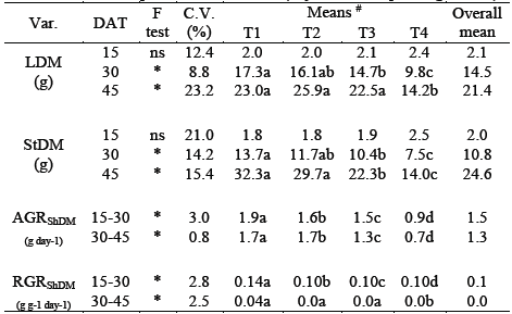 The AGRShDM indicates the variation of growth within a certain time interval and gives an idea about the mean growth rate over the observation period. The RGRShDM expresses the increase of dry matter per unit of preexisting mass, within a time interval, giving an idea about the boost of growth. Thus, RGRShDM has been considered the most adequate measure to evaluate plant growth [12].