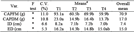 For fresh (CAPFM) and dry matter of capitulum (CAPDM), there were significant differences (p<0.05) between the control treatment (T1) and the others (T2, T3 and T4), which did not differ statistically (p>0.05) from one another. Plants submitted to treatments containing NS prepared in treated domestic effluent (T2, T3 and T4) showed on average reductions of 31.81 and 34.77% for CAPFM and CAPDM, respectively, compared to the control treatment (T1) (Table 4). Souza et al. (2018) also observed a reduction in capitulum dry matter (CAPDM) of ornamental sunflower cv. Anão de Jardim cultivated in nutrient solution prepared in treated domestic effluent compared to the control treatment, in which the solution was prepared with supply water [2].