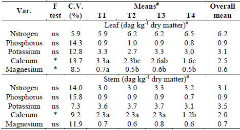 For the content of Ca in stem tissues, in plants under T4 treatment (NS with 50% concentration of nutrients in treated domestic effluent), the content was significantly lower (45.73%) in comparison to the mean content of other treatments (T1, T2 and T3), which did not differ statistically (p>0.05) from one another. Despite these variations, plants did not show any symptoms of deficiency or toxicity neither in leaves nor in inflorescence.