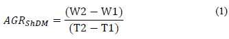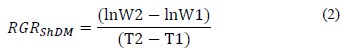 W1 and W2 - ShDM of plants at times T1 and T2 (day), respectively.