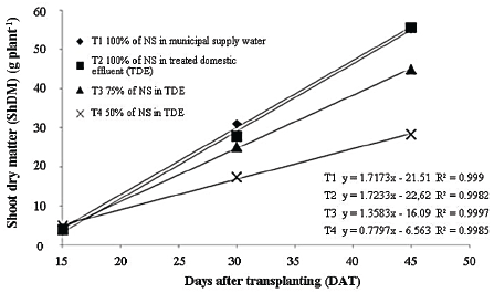 By evaluating the treatments based on RGRShDM and on the saving of fertilizers, it is possible to see that the data indicate that NS prepared with supply water and containing 100% of the concentration of nutrients (T1) can be used until 30 DAT, whereas the NS prepared with treated domestic effluent containing 75% of the concentration of nutrients (T3) is the most recommended for the rest of the crop cycle.