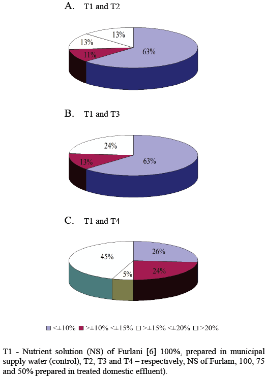 On the other hand, in a comparison between results of the T1 and T4 treatments, only 26% (10) of the variables evaluated showed results with variation of <±10% and in this case the highest percentage of variables (45% or 17 variables) were grouped in the class with variation of >±20% (Fig. 3C). These results indicate that the plants in the treatment T4, even with acceptable characteristics for commercialization of stems, showed for most variables different results in comparison to those observed in the control treatment (T1), in contrast to plants of the treatments T2 and T3. These results allow us to infer that the use of treatment T4 (NS with 50% concentration of nutrients prepared in treated domestic effluent) should not be recommended for the cultivation of ornamental sunflower cv. Anão de Jardim.