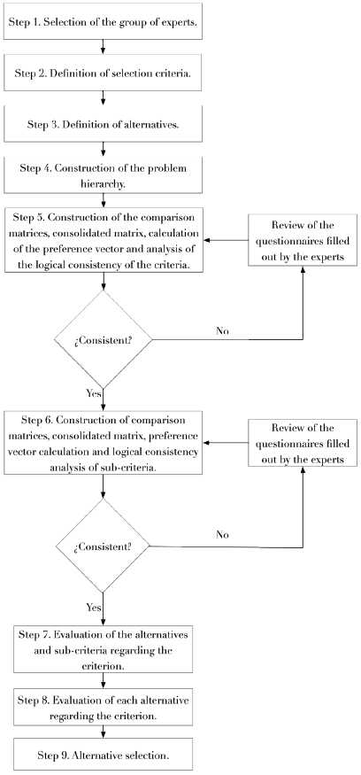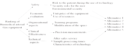Sequentially, the multi-criteria decision tool from AHP was selected, which is widely used in different areas, such as: health, political, economic, social and management sciences [20-26]. One of the relevant characteristics for the selection of this tool was its natural capacity to perform bi-univocal comparisons through matrix operations. In this way, it is possible to establish priorities among the elements of a level, with respect to an element of the next higher level. Fig. 1 shows the methodological scheme implemented for the blood gas analyzer equipment, based on Saaty and Lee [27].