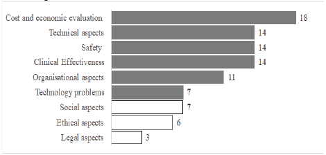 From the literature review, two main assessment models were identified: i) Core model, developed by the European Network for Health Technology Assessment (EUnetHTA), ii) mini-HTA, developed by the former Danish Center for Health Technology Assessment, and the model developed by the project Adopting Hospital Based Health Technology Assessment (AdHopHTA), in the European Union. Fig. 2 shows the criteria frequently used in the assessment of medical devices, highlighting those used in the model. This result shows that internationally, multidisciplinary assessments which consider factors other than purely economic aspects are conducted and include factors such as: technical, safety, clinical effectiveness, organizational, social, ethical and legal.