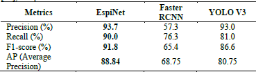 Table 2: EspiNet model against Faster-RCNN (VGG16 based) [49] and YOLO V3 [54], comparative results - Results on UMD dataset.