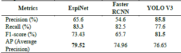 The proposed EspiNet V2 model obtain of 88.8% of AP and 91.8% of F1-score [56], which outperforms results for YOLO and Faster R-CNN (VGG16 based). Table 2 shows the comparative results. Fig. 6 presents a graphic comparison of the three models Average Precision (AP).