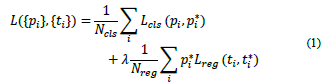 In eq. (1)i is the anchor index in a mini-batch (with positives and negatives examples anchors), p i is the predicted probability that the anchor i is an object. The ground truth (gt) p i * has label 1 if the anchor is positive, 0 is the anchor is negative. t i represents the predicted bounding box using a vector of 4 parametrised coordinates, where t i * is the gt box coordinates vector related to a positive anchor.