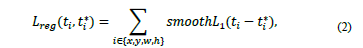 The classification loss L cls part uses a logistic regression cost function. Meanwhile for the bounding box regression loss part L reg (t i ,t i *) the robust loss function (smooth L 1 ) is used.