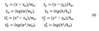 where x, y, corresponds to the boxs center coordinates, w, and h its width and height. Variables x corresponds to predicted box, x a anchor box and x * ground-truth box, (similarly for y, w and h variables). This can be assumed as a bounding-box regression from an anchor box to the closest ground truth box. The coordinates of the bounding box are values [0,1] which are relative to a specific anchor. For example, t y denotes the coefficient for y (box center x,y). If t y is multiplied by h a and then add y a we get the predicted y. The rest of parameters can be calculated in the same way.
