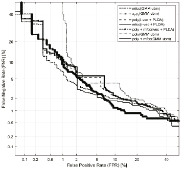 Results from this fusion strategy are presented in Table 3. As can be seen, important improvements were attained when comparing with results presented in Table 2. In particular, there are some losses with respect to the GMM+MAP adaptation based system when combining MFCC with S1 or S2. However, the speaker verification system based on i-vectors + PLDA and using as feature vectors the fusion of MFCC + S1 achieves an EER = 2.11%, which is the lowest EER for all systems we are comparing. These results are also in line with previously reported research in [20] where fusion was used as a strategy to enhance performance in a speaker verification system. Finally, to complement results presented in Tables 2 and 3, Fig. 4 depicts the comparison of all systems using the DET curve [44]. As can be seen, the MFCC+S1 / GMM-UBM based system presents the best performance when compared to other approaches.