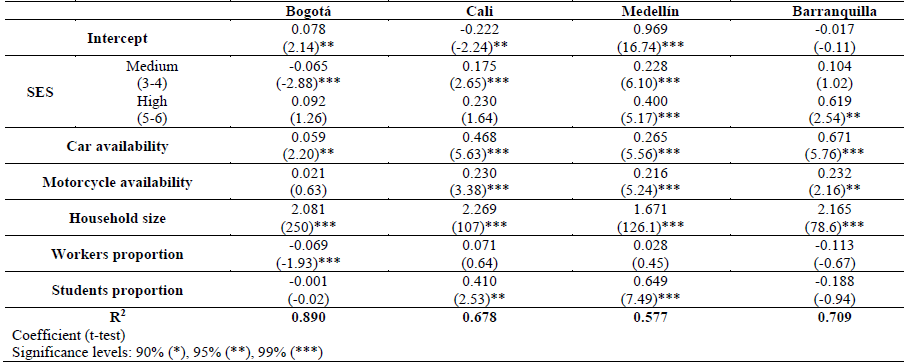 The analysis focused in Bogotá, Cali, Medellín and Barranquilla, the four most important cities in Colombia. The work had two relevant components. In the first, we estimated ordered logit regression models to determine the predictive power of income from SES, considering the following household characteristics: size, vehicle availability and proportion of workers and students. In the second, daily trip generation models by household were estimated using SES and income as explanatory variables, and adding the significant attributes from the first evaluation in order to test if similar results can be obtained when using SES as a proxy variable for income.