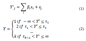 In an ordered logit regression model, level k of the observed response in the ordinal dependent variable Y is given by the relation between a lineal estimator Y’ j , constructed from a set of explanatory variables x i multiplied by the coefficients β i to be estimated, plus a component of error εj, and some thresholds t k-1 that must also be estimated. This formulation is summarized as indicated in equations (1) and (2).