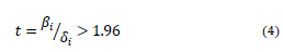 Note that the regression coefficients ß i correspond to the log-odds ratio of the independent variable against the dependent variable. Besides, the vector of coefficients ß i does not depend on the number of categories j, so one can assume that the connection between Y and x i is independent of this value, so the log-odds ratio of probability is considered constant throughout all k points of response [26]. Hence, by estimating the values of the regression coefficients and their significance level, it is possible to identify the link between independent and dependent variables. The significance of the coefficients was evaluated through the Student's t-test, where the t-statistic is equal to the value of the coefficient divided by its standard deviation (equation 4). This value must be greater than 1.96, assuming a significance of 95%, to reject the null hypothesis that the coefficient is statistically equal to 0.