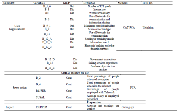 The IUPITIC index compromises the use of quantitative and qualitative variables, consequently, in order to elaborate the Use sub-index, the method of Analysis of Main Categorical Components-CATPCA is used, which allows treating qualitative variables, for the construction of the Preparation and Impact sub-indexes is used in Main Components Analysis -ACP, and for the IUPITIC composite index the weighted weights method is applied. Finally, a single factor ANOVA is used in order to measure the gap.