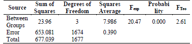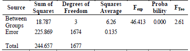Carrying out a more objective study, an Analysis of Variance-ANOVA is applied in order to test the hypothesis of equality of means. It was concluded at a confidence level of 95% that there are significant differences in the Use, Preparation and Impact of ICTs between micro, small, medium-sized and large companies in the evaluated sector, with a 𝐹𝑒xp= (46.413) > 𝐹𝑇eo = (2.61), as presented in the ANOVA of Table 2.
