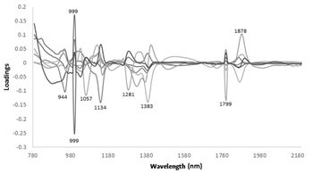 It is possible to know the contribution of each wavelength to each of the main components of the PCA model from the loadings (Fig. 3). The peaks are evident in the characteristic bands of water presence, around 999 nm and 1400 nm, and the peaks close to the absorption bands of groups C-H are around 944 and 1878 nm [17]. These wavelengths turn out to be significant in the change from the state of maturity 3 to the state of maturity 5 in agraz. Once again, the idea is reinforced that the fruit moisture content during the storage period decreases and that its content of total soluble solids - TSS increases [20].