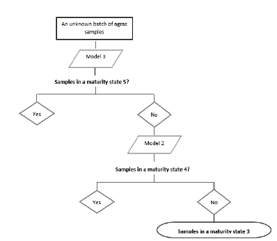 As an example of the agraz case, the practical use of the classification models could be as follows (Fig. 4): There is a batch of ungraded agraz, if the model 3 is used, samples in maturity stage 5 or not can be distinguished with a precision close to 100%. If this is not their maturity stage, model 2 is used to classify them in a state of maturity 4 with 95.65% accuracy, to finally know if this sample is in state 3 or state 4 of maturity.