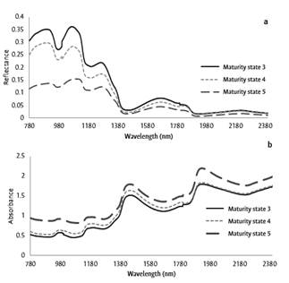 Figure 1: Spectral responses for the three stages of maturity of the agraz fruit. a. Reflectance spectrum and b. Absorbance spectrum.