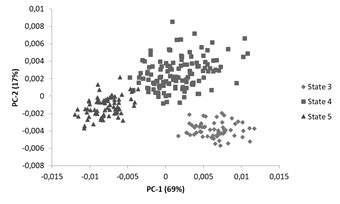 From the comparison chart of the first two main components for the agraz samples, it is possible to observe that the maturity stages 3, 4 and 5 are easily differentiable under 86% of the explained variance of the sample. With the first main component, it is possible to discriminate easily between states 3 and 5. For example, samples with higher moisture content, stiffer and reddish are found on the right (PC-1 positive) and fewer stiff samples, dark purple color and with lower moisture content are observed on the left (PC-1 negative). Similarly, with the second main component, it would be possible to distinguish in a certain way between state 3 (in the lower part, PC-2 negative) and state 4 (upper part, PC-2 positive) (Fig. 2). Results reported by [19] show similar behavior for samples of passion fruit in different stages of maturity under a principal component analysis.
