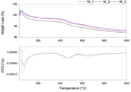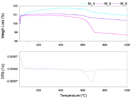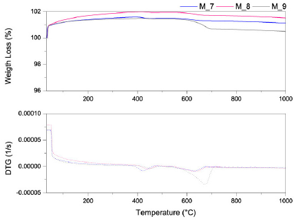 The mixtures of clays treated at 1000°C show a weight gain between the initial (room) temperature and 450°C (Fig. 6). After this temperature, slight weight loss occurred below 600°C where the gain matter during the testing was lost. Mixture M_8 (50%-50%) had a higher sorption capacity than the others at 1000°C. The weight gain was due to sample sorption of the purge gas (nitrogen) and some explanation exists about the surface activation discussed for the mixtures treated at 800°C.