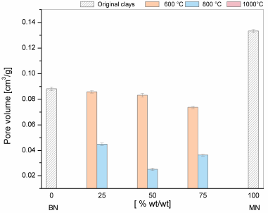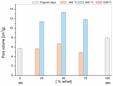 Figure 8: Textural properties of the pore volumes of the mixtures of clays at different thermal treatments.