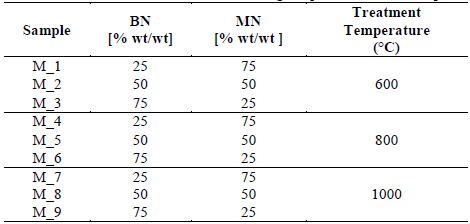 Bentonite (BN) and montmorillonite (MN) samples were obtained from two commercial natural clays (BAST SAS and CIPA SA companies, respectively). Both the Colombian companies focus on animal feeding additives and cat litter products. The raw material was analyzed on the basis of structure and texture. Samples were obtained without any purification process. Both the clay samples where physically dry mixed at three different weight proportions 25 w.t %, 50 w.t %, and 75 w.t %)for 15 min using a closed glass bottle. All samples were crushed and sieved in Tyler No 325, 45 µm to obtain fine powders. Then, they were thermally treated in a conventional furnace at three temperatures (600°C, 800°C, and 1000°C) for 4 h under an air atmosphere and at a heating ramp of 10ºC/min. The experimental variables and the names of the samples are shown in Table 1. The temperatures values were chosen to produce textural changes of the clays and avoid melting and bonding of metallic oxides at temperatures higher than 1000°C.