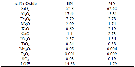 The results of X-ray fluorescence and diffraction of the clays are shown in Table 2 and Fig. 1, respectively. Both the samples have a high content of SiO2 and Al2O3. Clear differences in the composition between the samples were recognized. Organic matter (LOI) contents that were approximately 15% and 12% were found in the BN and MN clays, respectively. The concentrations of SiO2, K2O, CaO, and SO3 of the BN sample were lower than those of the MN sample. Moreover, a higher content of Al2O3 and Na2O in the BN sample (Table 2) suggested sodic bentonite clay, as has been reported by Gong et al. and Boylu et al. [18, 19].