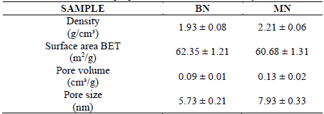 The densities and textural properties of the commercial clays are presented in Table 3. The surface areas were close to 62 m2/g and 61 m2/g for BN and MN respectively. They are low surface areas for catalytic applications; however, the potential of pillarization methods to increase the surface areas has been reported [20]. Regardless, the values of the pore features of the MN samples were higher than those of the BN samples. Moreover, X-ray diffraction revealed that the diffraction patterns exhibited by the MN samples were more than those of the BN samples. This implied that that the structure of the MN sample was more complex than that of the BN sample because of the presence of a diverse phase that could produce adequate disorder to increase the pore size. [21]