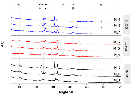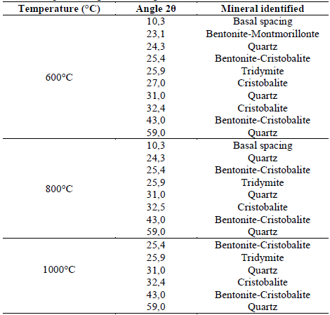 Structural changes are observed in the samples as a result of the thermal treatment. As the temperature increased, i) the basal spacing intensity at 2θ ≈ 10º was reduced and at 1000ºC, this peak disappeared. ii) The peak intensities of the quartz and bentonite crystals minerals decreased because of the loss of carbonates and alkaline oxides that were present in the original clay. The results agree with the structural changes reported by Bayram et al., 2010 [16], especially for the collapse of the 2:1 (TOT) layer in smectite clays and the conversion of amorphous in crystalline structures at temperatures higher than 1000ºC [22]. Samples M_3, M_6, M_9, had higher intensities in the quartz peak because the concentration of BN (bentonite) was higher in the mixture (75 w.t%).