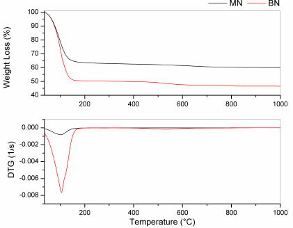 The thermal behavior of both the clays is presented in Fig. 2. A common initial thermal event was observed between room temperature and approximately 200°C, which was associated with water release. However, the offset thermal event was different. The MN offset was approximately 190°C, and the BN offset was 170°C. In addition, weight losses of the clays due to water release were approximately 40% and 50% for MN and BN, respectively. Because of the presence of organic matter, a slight thermal event was observed for the BN samples between 400°C and 600°C.