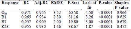 The significance of the model was determined by performing an analysis of variance (ANOVA) using the language for statistical computing R [30], where the results are given in Table 5. F-test and P-value were used to determine the significance of the model. P-values lower than 0.0001 were obtained for all the models, implying that the models are significant.