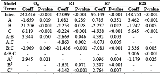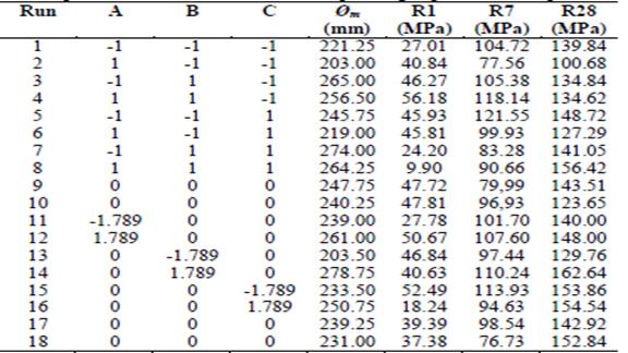 According to eq. (3) a quadratic polynomial regression model was adjusted for each response (R1, R7, R28, and Øm,). There were two steps involved in this process: first calculating a proper model, and then verifying the accuracy of the selected model. In this study, a backward stepwise process was used to achieve an accurate model for each response. It starts with the full second-order polynomial model, eq. (3), performed to estimate the relationship between the variables and the responses based on experimental results from CCD. Then, the process is followed by removing the variable with the largest P-value. The procedure continues until only those variables which are significant (P-value<0.05) remain in the model. Once the non-significative term was removed, the adjusting model process is repeated until all the non-significative terms have been removed from the equation. The first-order variable with no significant P-value must remain in the model only if any of its second-order variables is significant. When the model has been created, residual analysis was performed to check its efficiency. The latter includes statistical calculation such as residual plots and residual standard deviation, in which the accuracy of the selected regression can be graphically appraised. The response surface graph can be drawn once the accuracy of the model is validated [31].