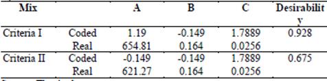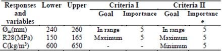 where U is an upper limit, L is a lower limit for a response, and wt i is the weight or shape of the function. Using different weights, the shape of the individual desirability for each target can be changed. The wt i value varies between 0.1 and 10. Values greater than 1 give more importance to the goal, having the weight values lower than 1 prompt the opposite effect. A weight of 1 implies that d i varies in a linear way. In this work, the multi-objective optimization process was performed in two consecutive steps, in which responses and factors were defined as a specific target by assigning a specific level of importance. Table 7 shows the goals of both optimization criteria for each response. Criteria I has been presented for selecting the optimum factor values to obtain a self-compacting mixture according to EFNARC criteria [32] with the maximum 28-days compressive strength. In this study, the slump flow was defined as ‘in range’ goal, while 28-days compressive strength was defined as ‘maximum’ goal. Once the optimization process is finished, one optimal solution, accomplishing the specified constraints was obtained. Criteria II adds to Criteria I the desire for minimum content of cement, maintaining a 28-days compressive strength over 150 MPa. In this work, the three responses: compressive strength, slump flow and cement content are considered equally important. Both optimized mixtures are shown in Table 8.