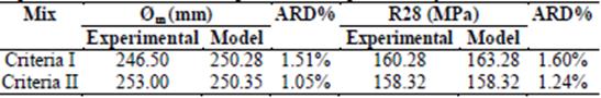 The efficiency of the mathematical-selected dosages was evaluated by carrying out the experiment under optimal conditions and by comparing obtained predicted values with the two mixtures presented in Table 8. Table 9 shows the absolute relative deviation between model and experimental values, ARD (%), which is used as a measure of predictability a toll for validation. The results confirmed that the experimental values are close to the values predicted by the multi-objective optimization.