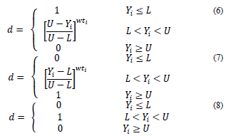 The individual desirability function form of each response for minimization, maximization and in range cases is shown in in eqs. (6), (7) and (8), respectively.