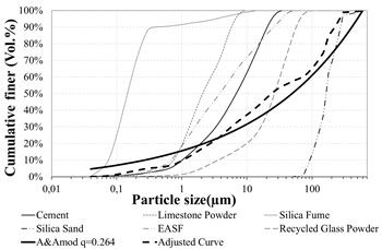 While striving towards a cost-effective and more sustainable RPC, the objective of this study is to effectively design and produce RPC with low cement amounts, with a maximum content of silica fume of 100 kg/m3. The design of the concrete mixtures is based on the aim of achieving compressive strength and rheological properties with minimum amounts of cement through a 3-factor Design of Experiments (DoE). To ensure a densely compacted cementitious matrix, the modified Andreasen & Andersen particle packing model (A&A mod ) [20] was used. Cementitious supplementary materials such as limestone powder, electric arc slag furnace and recycled glass flour were used as a partial replacement for cement and silica fume in the concrete.